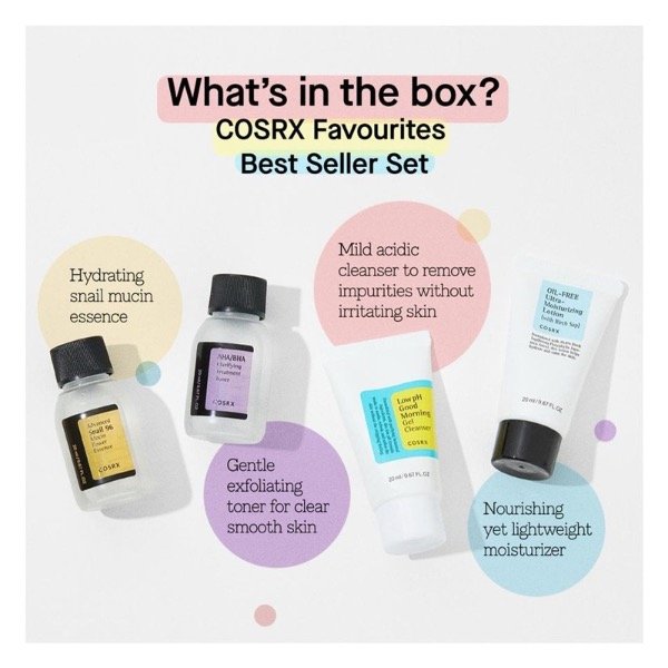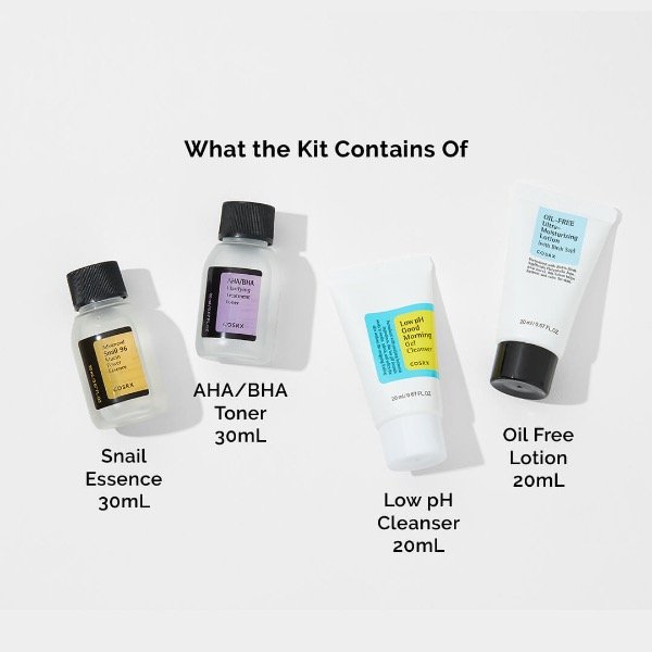 Tónico clarificante AHA/BHA de 20 ml: penetra eficazmente en la piel y limpia los poros obstruidos. Además, ayuda a la piel a reconstruir su barrera de hidratación. Esencia avanzada de mucina de caracol 96: esencia ligera que se absorbe rápidamente y le da un brillo natural desde el interior. Gel limpiador Good Morning de bajo pH: limpiador suave en gel con un pH ligeramente ácido. Loción ultrahidratante sin aceite: esta loción ligera y sutil contiene un ingrediente natural respetuoso con la piel, rico en vitaminas y antioxidantes, que calma y trata eficazmente la piel irritada, proporcionándole la nutrición que necesita.
