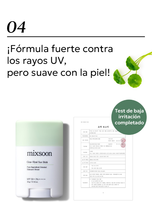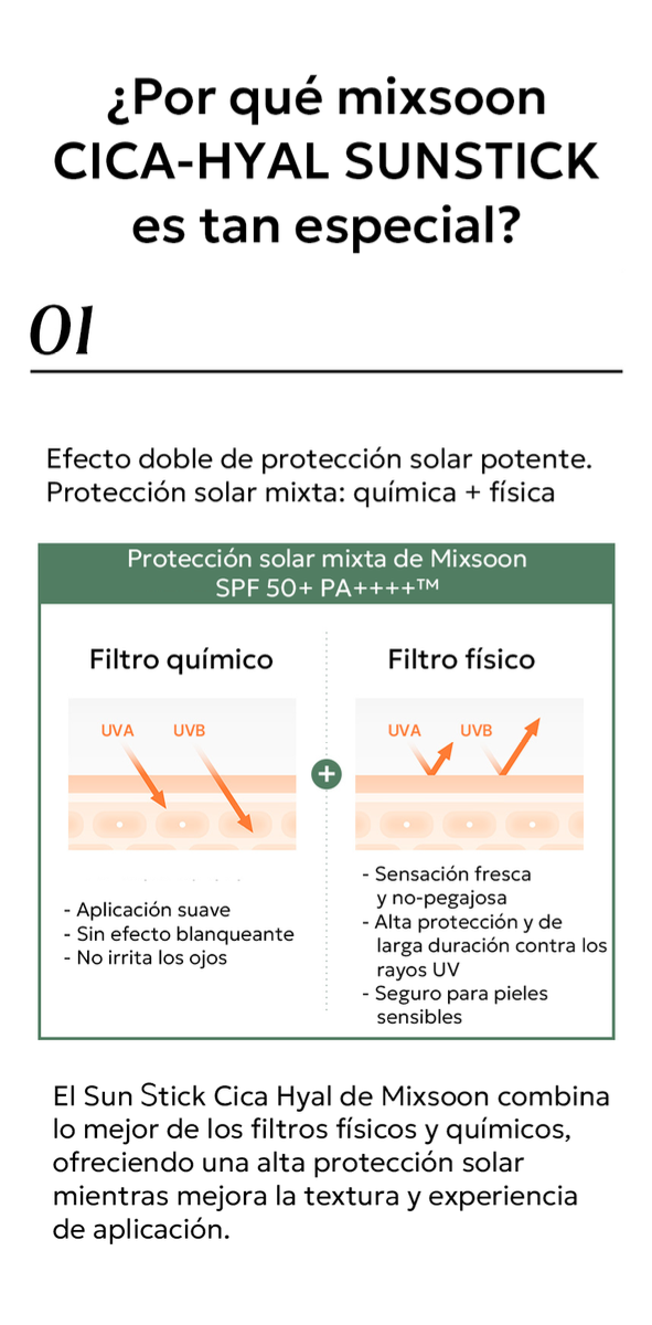 Mixsoon Cica-Hyal Sun Stick SPF50+ PA++++ es la opción ideal para quienes buscan una protección solar efectiva con un extra de hidratación.