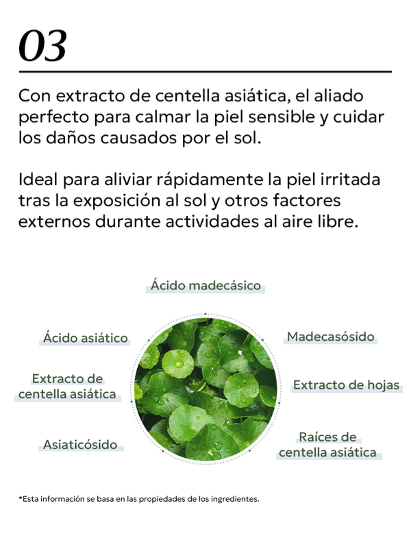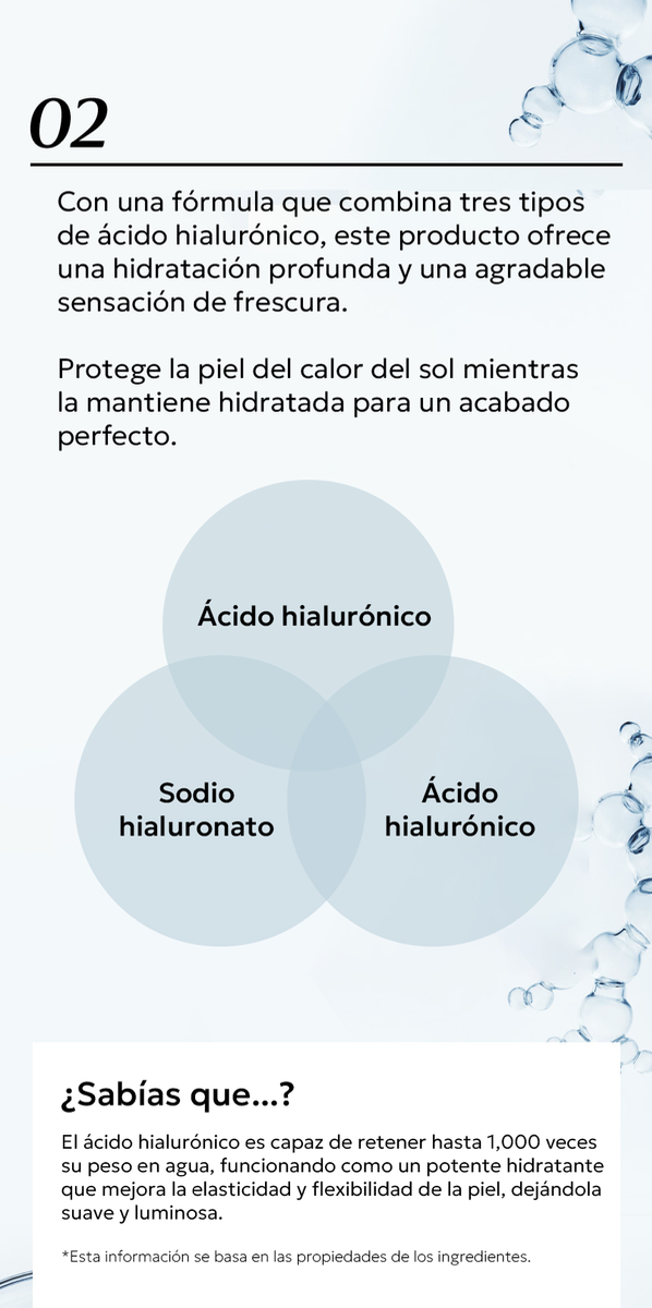 Su fórmula refrescante está enriquecida con tres tipos de ácido hialurónico para una hidratación profunda y extracto de centella asiática, que calma la piel sensible o irritada.