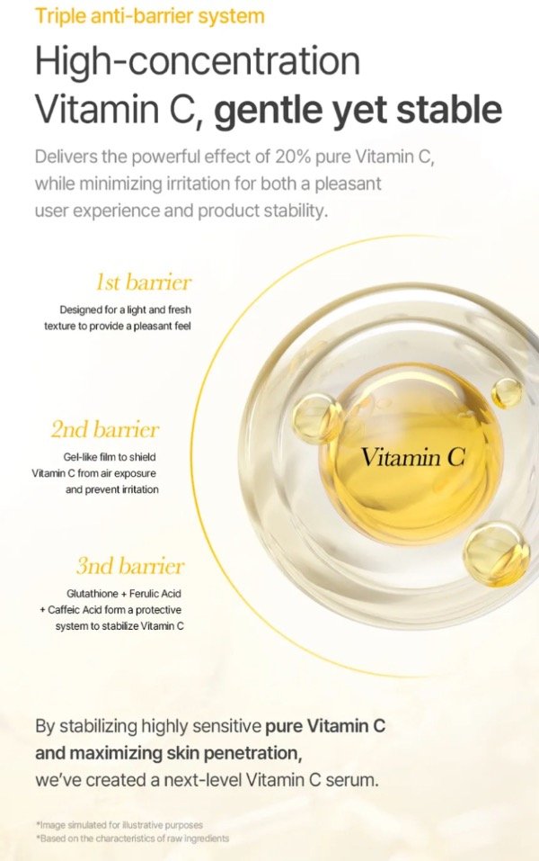 Contiene glutatión, ácido ferúlico y ácido cafeico para estabilizar y proteger la vitamina C en la fórmula.