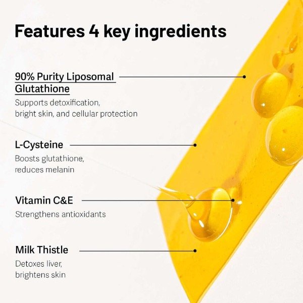 Extracto de levadura de L-glutatión liposomal 34,22 % (de los Países Bajos/extracto de levadura, lecitina), pululano, vitamina C, stevia tratada con enzimas, polvo de jugo de limón [dextrina, jugo de limón (100 %; elaborado en Estados Unidos), goma arábiga, ácido cítrico, saborizante], hidroxipropilmetilcelulosa, polvo de extracto de cardo mariano (elaborado en Estados Unidos), β-ciclodextrina, glicerina, saborizante (limón natural), otros productos vegetales y aceites comestibles, vitamina E, pigmento amarillo de Giza, polisorbato 80, clorhidrato de L-cisteína, ácido cítrico, almidón modificado de leche