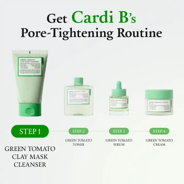 Limpiador y mascarilla de arcilla vegano que contiene un 49% de extracto de tomate verde, junto con arcilla bentonita y caolín para exfoliar suavemente y limpiar la suciedad y las células muertas de la piel mientras controla la producción excesiva de sebo. El extracto de centella asiática y la ceramida NP en la fórmula calman la piel, retienen la humedad y fortalecen la barrera cutánea, dejando la piel saludable.